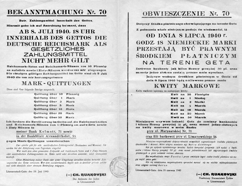 W czerwcu 1940 roku został uruchomiony przez Friedricha Übelhoera prezesa rejencji kaliskiej – na terenie getta Bank Emisyjny, mieszczący się przy ul. Marysińskiej 71 z filią przy ul. Limanowskiego 56. Bank ten stanowił nadzór nad emisją pieniędzy gettowych zwanych „rumkami”, które były jedynym legalnym środkiem płatniczym na terenie getta. Wymiana pieniędzy, jaka się z tym wiązała spowodowała znaczne utrudnienie nielegalnego handlu z tzw. aryjską częścią miasta.