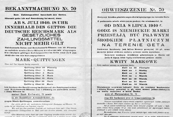 In June 1940, Friedrich Uebelhoer, the chairman of the Kalisz region, launched the Bank of Issue in the ghetto, located at 71 Marysińska Street, with a branch at 56 Limanowskiego Street. The Bank was in charge of supervising the issuance of ghetto money (called “rumki”), which was the only legal currency in the ghetto. Exchange of money that was associated with it resulted in a significant impediment to illegal trade with the so-called Aryan part of the city.